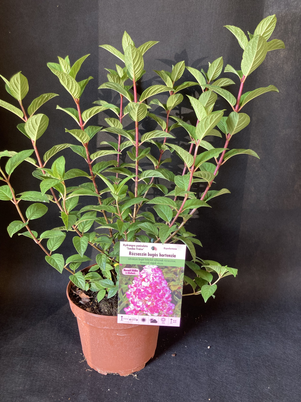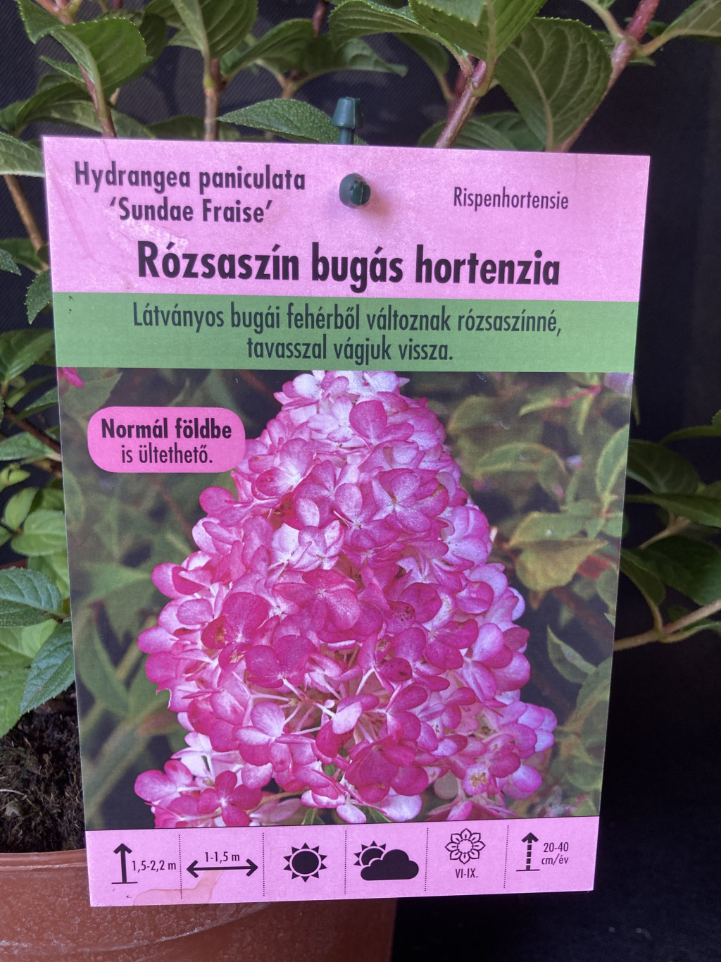 A Sundae Fraise bugás hortenzia steril virágokból álló 10-15 cm hosszú tölcséres bugái eleinte hófehérek, később élénk rózsaszínek, júliustól- szeptemberig nyílnak a fiatal hajtások végén.