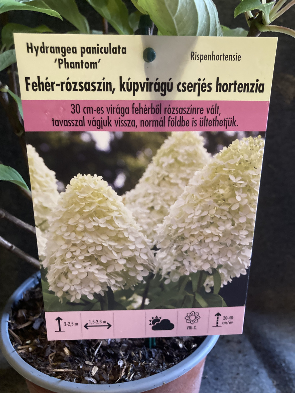 A Hydrangea paniculata 'Phantom' az egyik legnagyobb virágú bugás hortenzia fajta, amely rendkívüli látványt nyújt a nyári és kora őszi hónapokban. Lenyűgöző, akár 30-40 cm hosszú, tömött virágbugái tiszta fehéren nyílnak, majd enyhén rózsaszínes árnyalatot vehetnek fel az ősz közeledtével. Ideális választás kertekbe, előkertekbe, sövényként vagy szoliterként is.